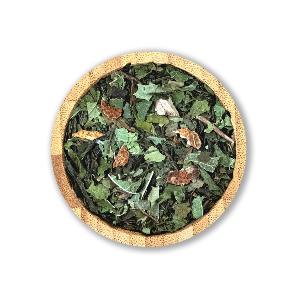 El té verde premium forma la base de esta mezcla, proporcionando una base suave y rica en antioxidantes. La verbena de limón, la mirto de limón y la cáscara de limón aportan un toque cítrico fresco, mientras que la ortiga, las hojas de abedul y la raíz de diente de león contribuyen con sus propiedades depurativas naturales, apoyando los procesos de desintoxicación del organismo. Las hojas dulces de mora añaden una sutil dulzura natural, haciendo que cada sorbo sea suave y delicioso.